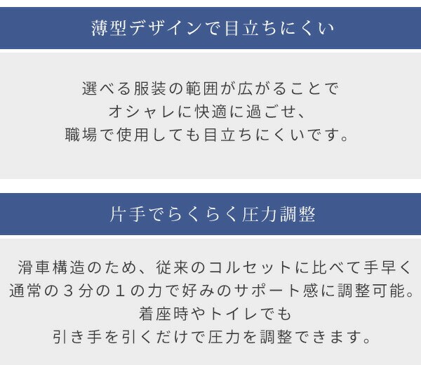| 商品説明 | ●サイズは3サイズ(Sサイズ、Mサイズ、Lサイズ)よりお選びください ●片手で楽々圧力調整 ●目立ちにくいコンパクトデザイン ●通気性のよいナイロンメッシュ ●紐は丈夫な三重編みで頑丈 ●腰痛を予防・改善 ●正しい姿勢をサポート ●骨盤矯正で美容もサポート ●お腹が引き締まりダイエット効果も ●重いものを持ちやすく背負いやすく ●心地良い装着感でズレにくい ●長期間安心して使える高品質設計 ●義肢装具メーカーだからできる確かな装着感と耐久性 ●座った状態でも片手で締め付け具合を調整できる独自設計 |