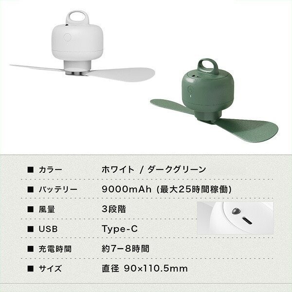 | 商品説明 | ●電源:リチウムイオンバッテリー9000mAh ●電圧:3.0V~4.0V ●充電ポート:USB Type-C ●充電時間:約6~7時間で満充電 ●駆動時間:最大約25時間 ●風量:3段階 ●リモコン付き ●切タイマー設定:2/4/6/8h ●吊り下げ方式でテントなどアウトドアにも最適 ●プロペラに触れると停止する安全設計 ●セット内容:本体、プロペラ、リモコン、日本語取説 |