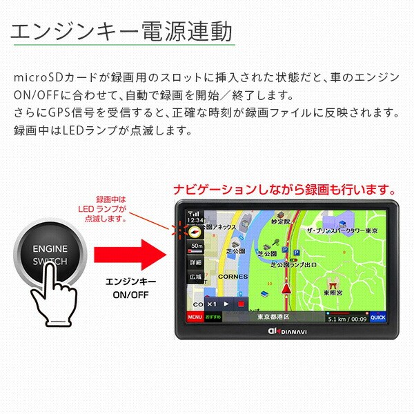 ●ドライブレコーダーを搭載しているのでカーナビの画面上で操作することができ、ナビゲーションをしながら録画することができます