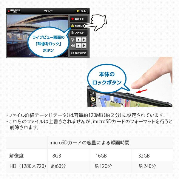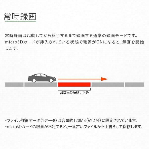 ドライブレコーダー画素数:100万画素●常時録画:常時録画は起動してから終了するまで録画する通常の録画モードです。microSDカードが挿入されている状態で電源がONになると、録画を開始します。