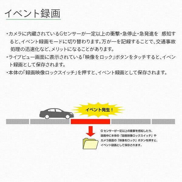 ●イベント録画:カメラに内蔵されているGセンサーが一定以上の衝撃・急停止・急発進を感知すると、イベント録画モードに切り替わります。万が一を記録することで、交通事故処理の迅速化など、メリットになることがあります。