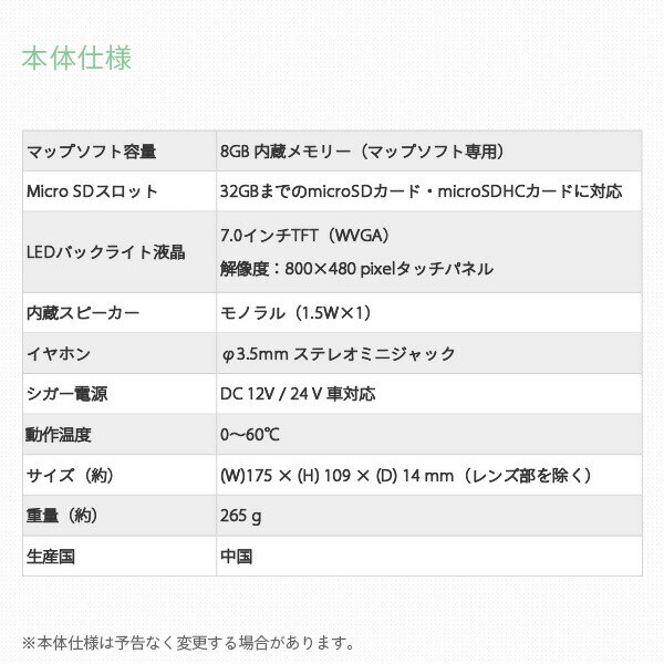 ・マップソフト容量:8GB 内蔵メモリー(マップソフト専用)