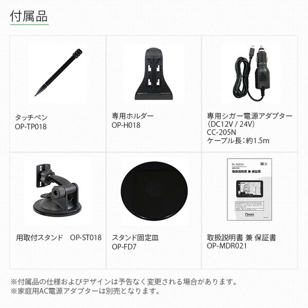 ●付属品:タッチペン、専用ホルダー、専用シガー電源アダプター、専用取付スタンド、スタンド固定皿、取扱説明書兼保証書