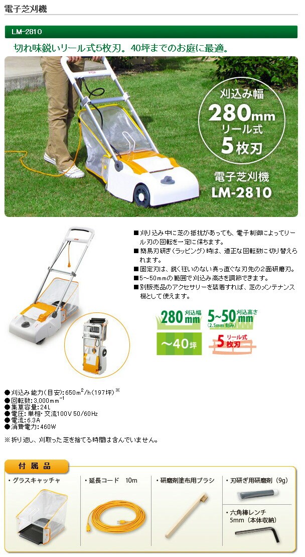 | 商品説明 | ●電圧:単相・交流100V 50/60Hz ●電流:6.3A ●消費電力:460W ●刈込み能力(目安):550平方m/h(167坪) ●無負荷回転数:芝刈り時毎分3,000回、歯止研ぎ時毎分500回 ●刈込幅:280mm ●刈込高さ:5-50mm ●集草容量:24L ●刈刃(リール式):5枚 ●走行方式:手押式 ●刃研ぎ機能(ラッピング):逆回転研磨方式 ●コード長さ:0.3m ●絶縁方式:二重絶縁 ●付属品:グラスキャッチャ、延長コード10m、研磨剤塗布用ブラシ、刃研ぎ用研磨剤(9g)、 ●六角レンチ(本体収納) ※注意:メーカー取り寄せ品につき、配送までお時間がかかる場合がございます。 ※注意:メーカー取り寄せ品につき、欠品の場合がございます、お急ぎの場合は、在庫の問い合わせをお願いします。 |