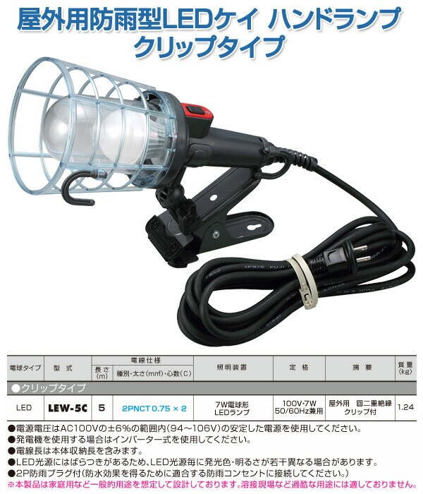屋外用防雨型LEDケイ ハンドランプ クリップタイプ LEW-5C LEDライト 照明 作業灯 照明用品 クリップランプ 蛍光灯ランプ 照明用品 ワークライト ハタヤ(HATAYA) 【送料無料】
