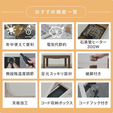 | 本体サイズ | 【こたつ本体】 105cmタイプ:幅105x奥行75x高さ36-41cm |