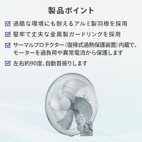 | 商品説明 | ●過酷な環境にも耐えるアルミ製羽根を採用 ●樹脂製に比べ蒸気や油煙の多い環境でもわれにくく、安心してお使いいただけます ●全閉式モーターと合わせてハードな現場に快適環境をお届けします ●堅牢で丈夫な金属製ガードリングを採用 ●リングの割れを防ぎ、不意の危険を回避します ●サーマルプロテクター(復帰式過熱保護装置)内蔵で、モーターを過負荷や異常電流から保護します ●左右約90度、自動首振りします ●全閉式モーターで内部にちりやホコリが侵入しにくく向上などの油気・油煙の多い場所でも保守性・信頼性の高いモーターです ●<仕様> ・電源:100V 50/60Hz ・電流:強0.98/1.19A ・消費電力:強90/118W ・風速:強268/305m/min ・風量:強141/161m3/min ・ファン:45cmアルミ製、4枚羽根 ・首振り/首折れ:約90度/4段階 ・騒音値:60/70dB ・電源コード:差込プラグからリモコンまで約2.4m、リモコンから本体まで約0.8m ●メーカー1年保証 |