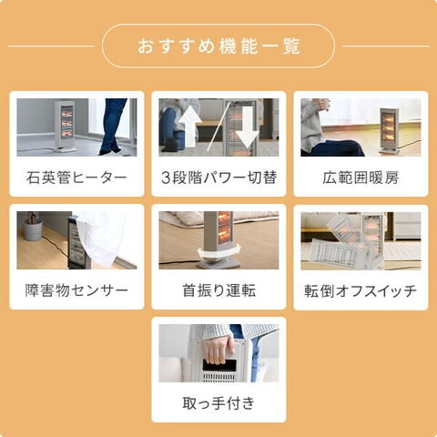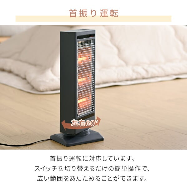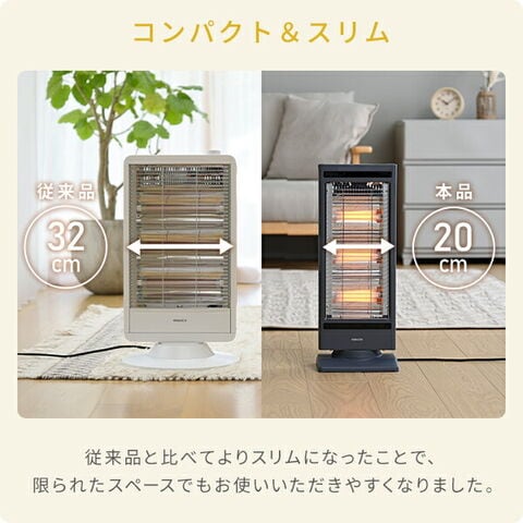 | 商品説明 | ●電源:AC100V(50/60Hz) ●消費電力:(弱)200W/(中)400W/(強)600W ●電源コード長さ:1.6m ●安全装置:電流ヒューズ、転倒OFFスイッチ ●障害物センサー搭載:カーテン、布団、衣類等が近づくとセンサーが反応して自動的に電源が切れる仕様 ※本体上下の発光部から光の反射を検知する方式のため、障害物の色や材質、大きさによって感知できない場合があります ※直射日光が当たる場所では感知できない場合があります ※本機能は万が一の危険を防ぐ機能です。乾燥目的の使用や燃えやすい物を置くことはお避け下さい。火災の原因になります ●左右首振り機能 ●左右首振り角度:約60度 ●発熱体:石英管ヒーター3本 ●メーカー保証:1年間 ※2025年8月から型番を「DS-K082」から「DS-AK06」に変更しております 【仕様変更点】 ・サイズをよりコンパクトな省スペース設計にしております。幅28.5×奥行15.6×高さ39.5cm→幅20×奥行17×高さ51cm ・出力切替を400/800Wから200/400/600Wに変更し、節電仕様にしております ・本体反射板を独自加工し、上部にも熱が伝わるようにしております ・障害物センサーを搭載しております |