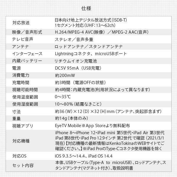 | 商品説明 | ●対応放送:日本向け地上デジタル放送方式(ISDB-T)1セグメント対応(UHF:13~62ch) ●映像・音声形式:H.264/MPEG-4 AVC(映像)、MPEG-2 AAC(音声) ●テレビ音声:ステレオ/音声多重 ●アンテナ:ロッドアンテナ/スタンドアンテナ ●インターフェース:Lightningコネクタ、microUSBポート ●内蔵バッテリー:リチウムイオン充電池 ●電源:DC5V 95mA(USB充電) ●消費電力:約200mW ●充電時間約3時間(電源OFFの状態) ●視聴可能時間:約4時間:内蔵充電池(利用状況によって異なります) ●使用温度範囲:0~35℃ ●使用湿度範囲:10~80%(結露なきこと) ●視聴アプリ:EyeTV Mobile※App Storeより無料配布 ●対応OS:iOS 9.3.5~14.4、 iPad OS 14.4 ●セット内容:本体、USBケーブル(Type-A to microUSB)、ロッドアンテナ、スタンドアンテナ(マグネット付き)、取扱説明書 ●iPhoneやiPadで、どこでもテレビが観れる、録れる ●LightningコネクタをiPhone、iPadに接続するだけでTVの視聴が可能 ●音を出せない時は字幕表示で視聴できます ●放送中の番組と次の番組が一目で分かります ●録画ボタンをタッチすれば、テレビ番組を録画できます ●放送中の番組を巻き戻して再生できます |