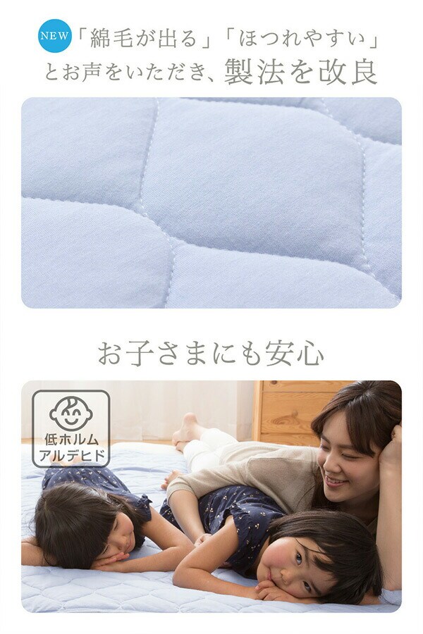 | 商品説明 | ●さらっとドライな綿100%の敷きパッド ●ひみつは「強撚糸」糸を強く撚り、空気層を無くすことでさらっとドライな質感と涼感を実現 ●抗菌防臭機能に抗ウイルス機能もプラス、洗濯しても効果が落ちにくい練り込み加工 ●中綿の配合を考え、吸湿量を上げることに成功し蒸れを軽減 ●洗濯機で洗えていつでも清潔 ※製造時期により、質感・色味・デザイン・梱包形態など、品質に差し支えない程度の仕様変更を行う場合がございます。 ※洗濯ネットをご使用の上、単独洗いをお願いします。 ※淡色及び、生なりの商品は、無蛍光漂白剤をお使いください。 ※タンブル(乾燥機)乾燥はお避け下ください。 ※洗濯後は放置せず、すぐに形を整えて干してください。 |