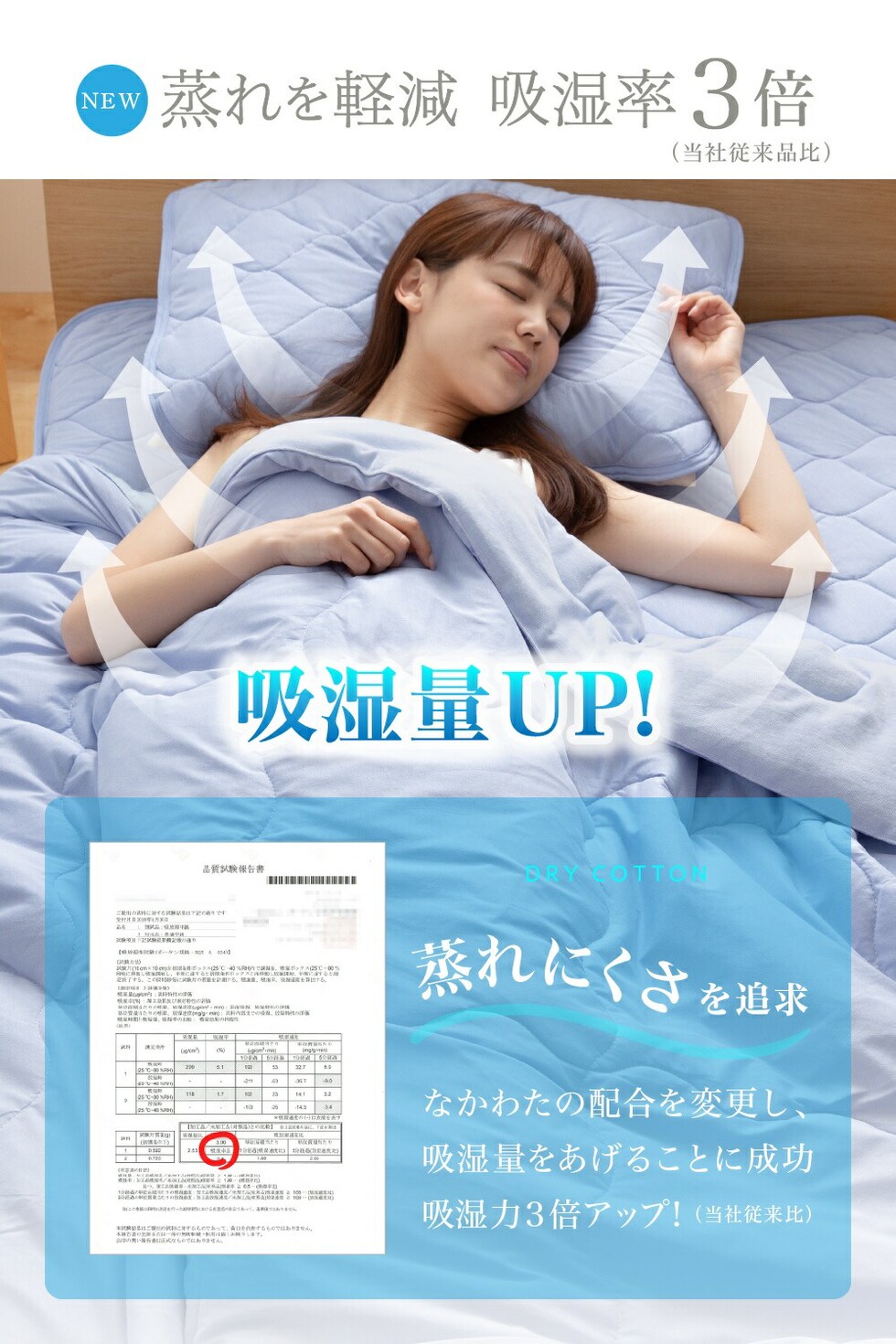 ●中綿の配合を考え、吸湿量を上げることに成功し蒸れを軽減
