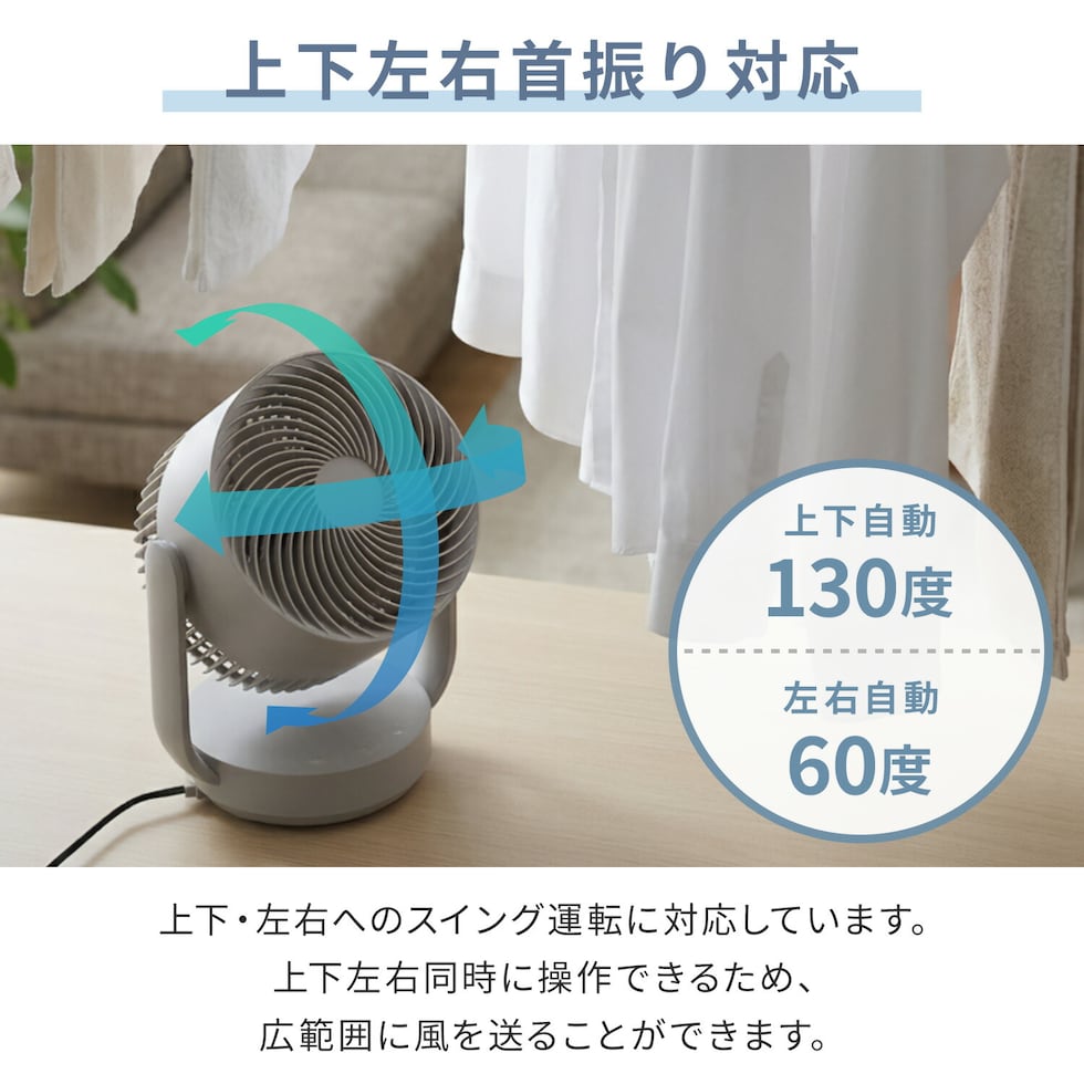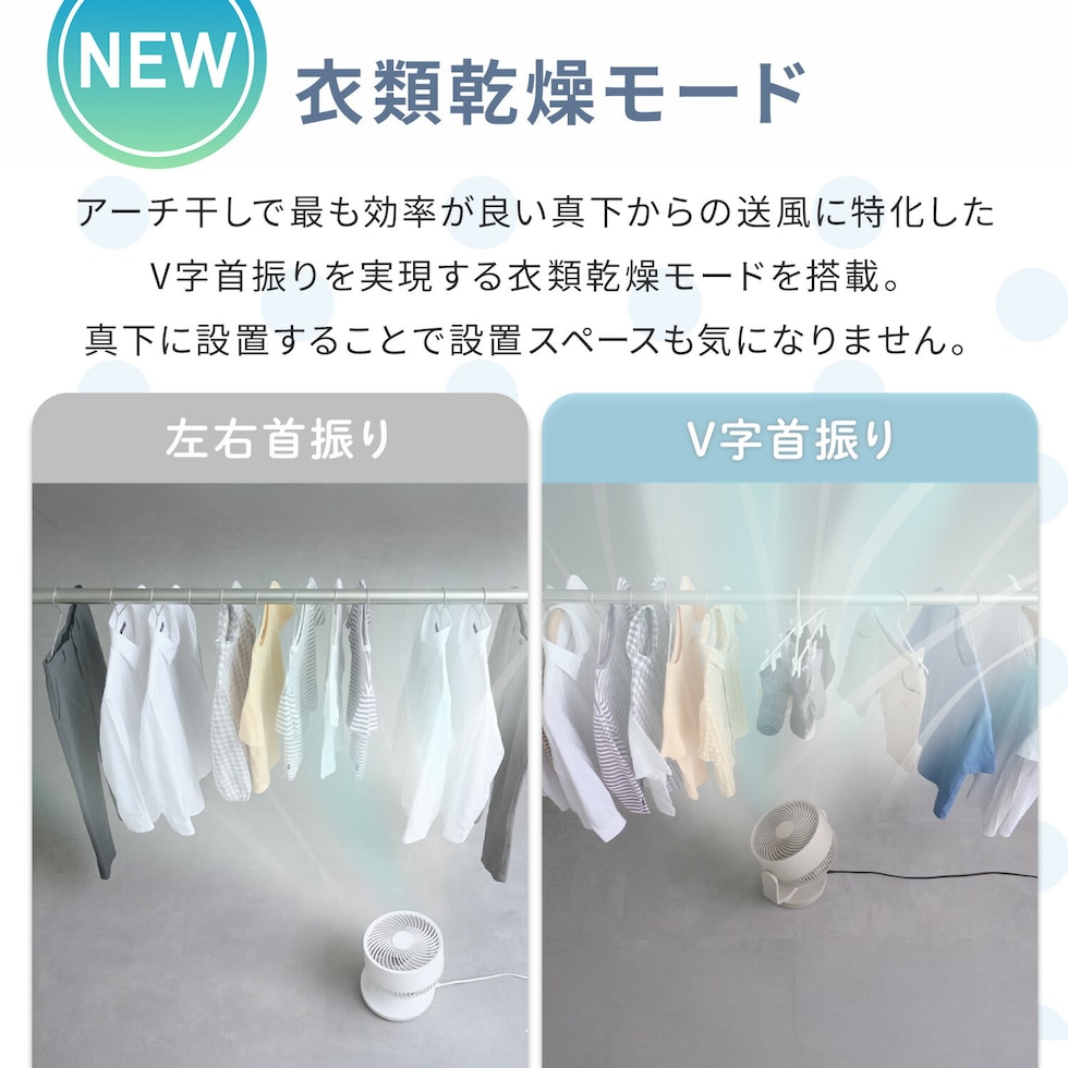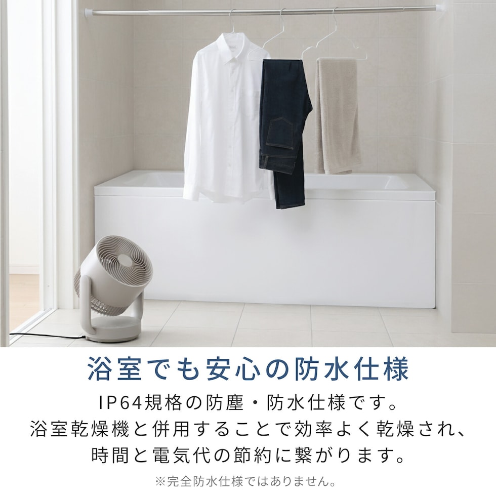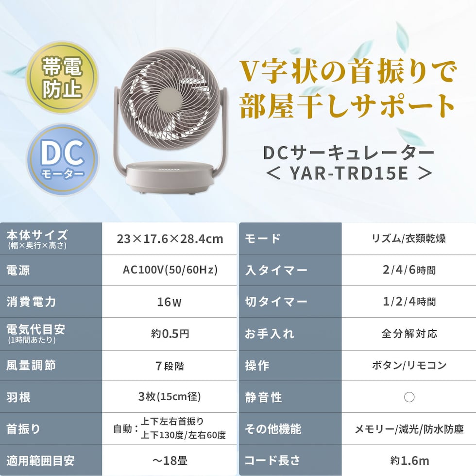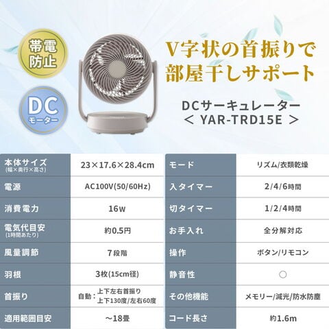 | 商品説明 | ●電源:AC100V(50/60Hz) ●消費電力:16W ●電気代目安(1時間あたり):約0.5円(50/60Hz) ●コード長:約1.6m ●DCモーター搭載 ●羽根:15cm径 3枚 ●風量:7段階 ●Wタイマー搭載:【切】1/2/4h 【入】2/4/6h ●リズム風搭載 ●衣類乾燥モード搭載:本体が上向きの状態から前後30度にV字状に首振りします。最大風量7で運転し、風量の調整はできかねます ●上下左右自動首振り搭載 ●左右首振り角度:約60度 ●上下首振り角度:約130度 ●前ガードに帯電防止加工を施してホコリ等の付着を抑えます ●リモコン搭載:本体に内蔵された磁石により操作部に保持できる ●お手入れ簡単:工具不要で前面ガード、背面ガード、羽根が取り外し可能 ※前面・背面ガード、羽根は水洗い対応 ●畳数目安:18畳まで ●全閉式モーター採用でIP64仕様。浴室での利用や浴室乾燥機との併用ができる防塵・防水仕様 ●メーカー保証:1年間 ※2026年4月から型番をYAR-ND15EからYAR-TRD15Eに変更しております 【仕様変更点】 ・簡易分解モデルから全分解モデルにアップグレード ・上下首振り範囲60度→110度に拡大 ・おやすみモードの無くし、衣類乾燥モードを搭載 ・全閉式モーター採用でIP64取得 ・帯電防止加工の前ガード採用 ・適用畳数~20畳→~18畳 ・消費電力:17W→16W |