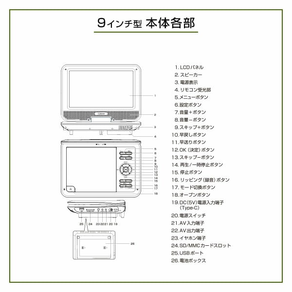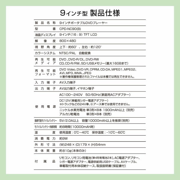 | 商品説明 | ●4WAY電源で自由自在! ●お手持ちのモバイルバッテリーで駆動可能 10000mAhバッテリー使用で約8時間駆動 ※5V2A以上のモバイルバッテリーを推奨 ※モバイルバッテリーはお客様でご用意ください ●ワンタッチで録音できるリッピングボタン搭載 CDリッピング機能:CDからUSB/SDカードにパソコン不要で録音可能 ●レジューム機能搭載:DVDを途中停止しても次回再生時に同じ場面から再生可能 ●液晶ディスプレイ:9インチ(16:9)TFT LCD ●解像度:800×480 ●視野角度:上下約60° 左右約120° ●カラ―システム:NTSC/PAL 自動変換 ●再生可能メディア:DVD、 DVD-R/DL、 DVD-RW、CD、 CD-R/RW、 SD/USBメモリー(最大16GBまで) ●再生可能フォーマット:DVD-Video、 DVD-VR、 CPRM、 CO-DA、 MPEG1、 MPEG2、 AVI、 MP3、 WMA、 JPEG ※著作権保護管理されたファイルは本機では再生できません ●入力端子:AV入力端子 ●出力端子:AV出力端子、イヤホン端子 ●使用電源:AC100-240V 50/60Hz(家庭用ACアダプター) DC12V(車載用シガー電源アダプター)※トラックなどの24V車、+アース車では使用できません ニッケル水素充電池 単3×8本 1900mAh以上(別売)、アルカリ乾電池 単3×8本(別売) ●接続可能モバイルバッテリー:5V/2.0A以上 容量10000mAh以上を推奨(別売) ●モバイルバッテリー持続時間:約8時間(10000mAh時) ●使用温度:0℃~40℃ ●保存温度:-10℃~60℃ ●消費電力:約9W ●付属品:リモコン、リモコン用電池(単4形乾電池2本)、AC電源アダプター、シガー電源アダプター、電源供給用USBケーブル、AVケーブル、車載取付用本体収納ケース、取扱説明書(保証書付) ※こちらの商品は2025年11月に仕様変更をしております。 ・型番: CPD-N90→CPD-NC90 ・使用電源:3WAY(AC、DC、乾電池(別売))→4WAY(AC、DC、乾電池(別売)、モバイルバッテリー(別売)) |