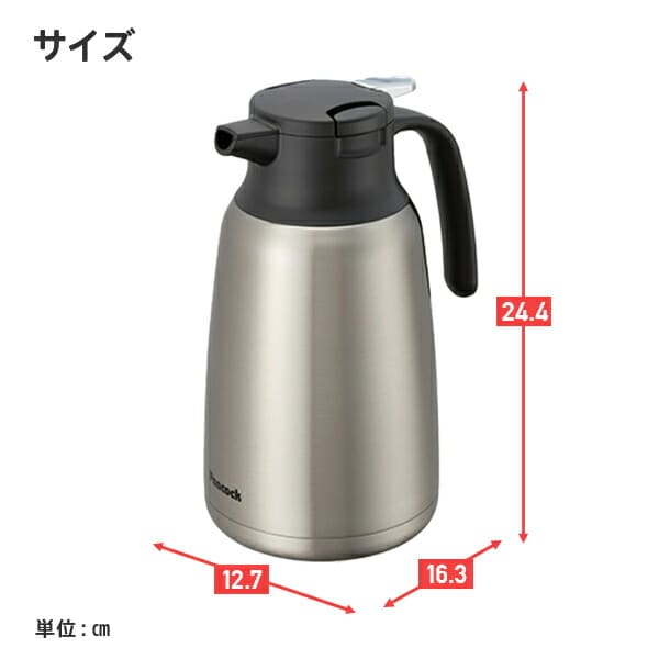 | 商品説明 | ●真空二重構造で長時間飲み物の温度をキープ ●電気を使用しないため省エネで経済的 ●注ぎやすいプッシュレバー開栓 ●ワンタッチ式中栓のため着脱簡単 ●保温効力:71度以上(10時間) ●保冷効力:9度以下(10時間) ●口径:約5cm |