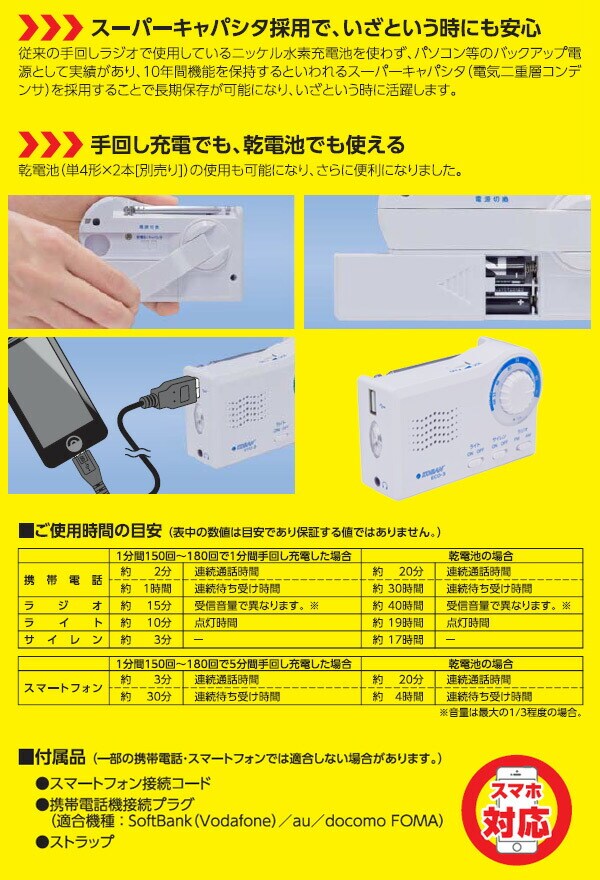 ●使用時間(手回し150-180回/分で1分充電した場合):ラジオ15分、ライト10分、サイレン3分、携帯電話通話2分、携帯電話待受け60分