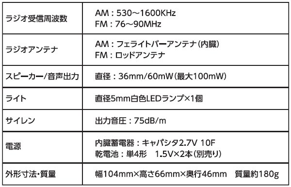 ●使用時間(乾電池):ラジオ40時間、ライト19時間、サイレン17時間、携帯電話通話20分、携帯電話待受け30時間、スマートフォン通話20分、スマートフォン待受け4時間