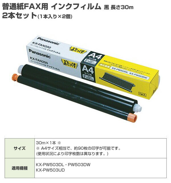 普通紙FAX用 インクフィルム 黒 長さ30m 2本セット(1本入り×2個) KX-FAN200*2 黒 FAXインクフィルム おたっくす パナソニック(Panasonic) 【送料無料】
