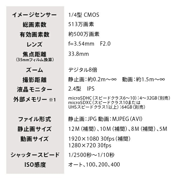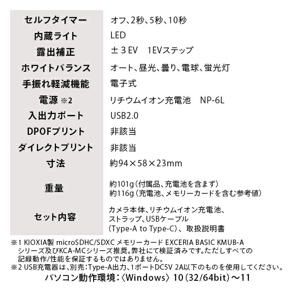 | 商品説明 | ●ポケットに入れて日常の景色を気軽に撮れる軽量コンパクトなデジタルカメラ ●焦点距離33.8m(35mm判換算)の広角レンズ採用 ●最短約20cmまで被写体に寄って撮影可能 ●オートフォーカス機能搭載 ●手ブレ軽減機能搭載(静止画撮影時) ●有効画素数約500万画素 ●デジタルズーム8倍 ●イメージセンサー:1/4型 CMOS ●f=3.54mm F2.0 ●撮影距離:約0.2~(静止画)、約1.5~(動画) ●液晶モニター:2.4型 IPS ●セルフタイマー:オフ/2秒/5秒/10秒 ●セット内容:カメラ本体、リチウムイオン充電池、ストラップ、USBケーブル(Type-A to Type-C)、取扱説明書 ※こちらの商品は2025年8月に仕様変更をしております ・型番:KC-03TY→KC-AF11 ・カラー:シルバー/ブルー/ピンク→ブラック/ホワイト/グリーン ・イメージセンサー:1/3.2型 CMOS→1/4型 CMOS ・有効画素数:1/3.2型 CMOS→1/4型 CMOS ・有効画素数:約800万画素→約500万画素 ・焦点距離(35mmフィルム換算):36mm→33.8mm ・ズーム:デジタル4倍→デジタル8倍 ・撮影距離:約1m~∞→静止画:約0.2m~∞、動画:約1.5m~∞ ・ファイル形式:静止画 JPG、動画 MJPEG(AVI)、音声 PCM→静止画 JPG、動画 MJPEG(AVI) ・オートフォーカス:無し→有り ・入出力ポート:miniUSB→USB Type-C |