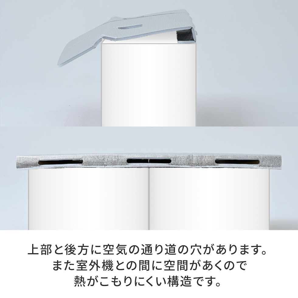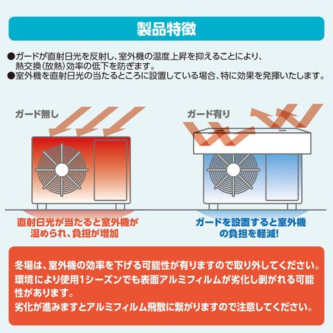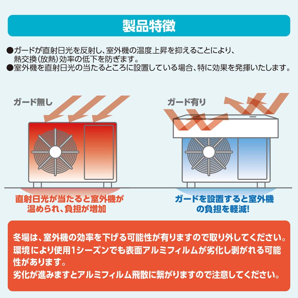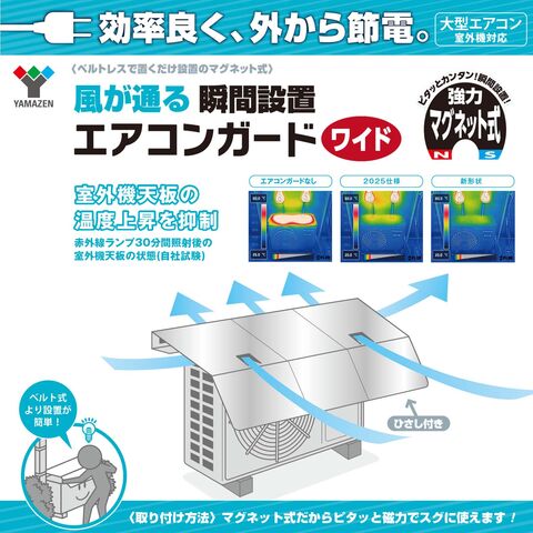 | 商品説明 | ●エアコン室外機の温度上昇を抑え、効率低下を和らげます ●リビング用として設置しているような大型室外機にも対応したワイドタイプ ●マグネット取付式で簡単設置 ●室外機とガードの間に空間があり、室外機の放熱を妨げません ●風飛び防止紐用の穴あり ●室外機の汚れ・劣化防止にも ●商品が大きい場合は調節可能なフリーカット仕様 ●耐熱温度:約70度 ※2026年3月より商品形状をリニューアルしました |