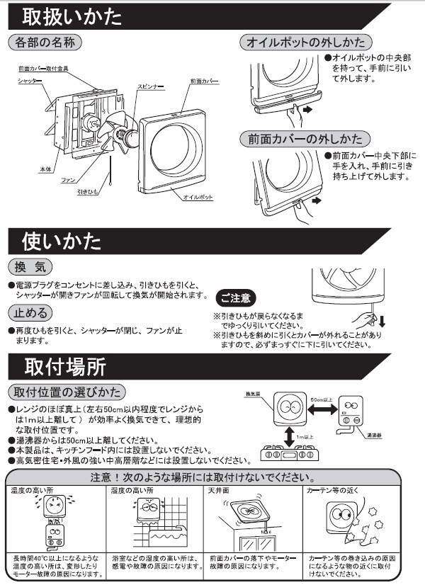 | 商品説明 | ●定格電圧:100V(50/60Hz) ●消費電力(50/60Hz):24/24.5W ●風量(50/60Hz):270立方m毎時 ●騒音(50/60Hz):35/36dB ●使用箇所:台所用 ●電源接続:プラグコード付 ●埋込寸法:180mm角 ●ファン形状:プロペラファン ●引きひも連動式シャッター ●羽根、前面カバーは樹脂製 ●電源コード約0.9m ●鋼板製ボディ ●付属品:取付ネジ 木ネジ 直径4×30mm 4本 ※キッチンフード内に設置不可 |