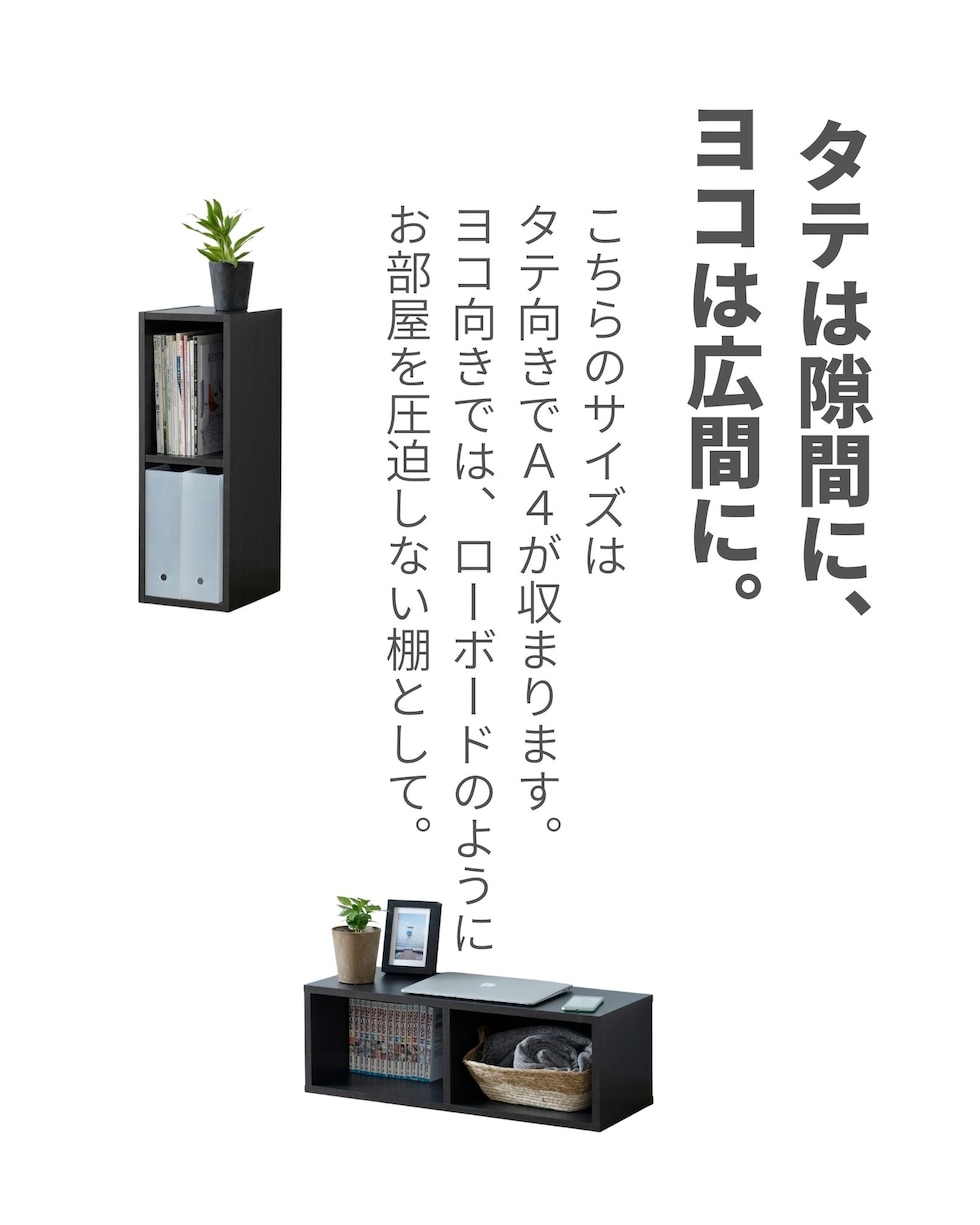 | 商品説明 | ●横向きはコミックに最適、タテ向きにA4ファイルも収納できるサイズ設計 ●背面化粧が追加され、間仕切りとしても活躍 ●タテ向き、ヨコ向き、単独、組み合わせ、使い方で広がる収納空間 ●収納部内寸(タテ向時):幅21 奥行27 高さ33cm ●タテ置き時耐荷重:天板、棚板15kg ●ヨコ置き時耐荷重:天板40kg ●ヨコ置きで積み重ねて壁面収納としても活躍 ※ヨコ向き4段まで積み重ね可能 ●連結用金具1セット同梱 ●ネジ隠しシール付属 ※2021年5月20日、2023年10月4日に、カラーバリエーションを変更しております。 |