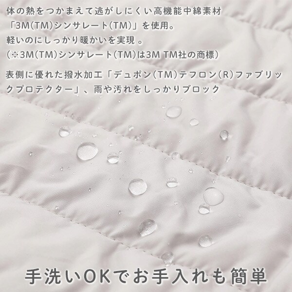 | 材質 | 表地・裏地:ポリエステル100% 中綿:ポリエステル100%(シンサレート) |