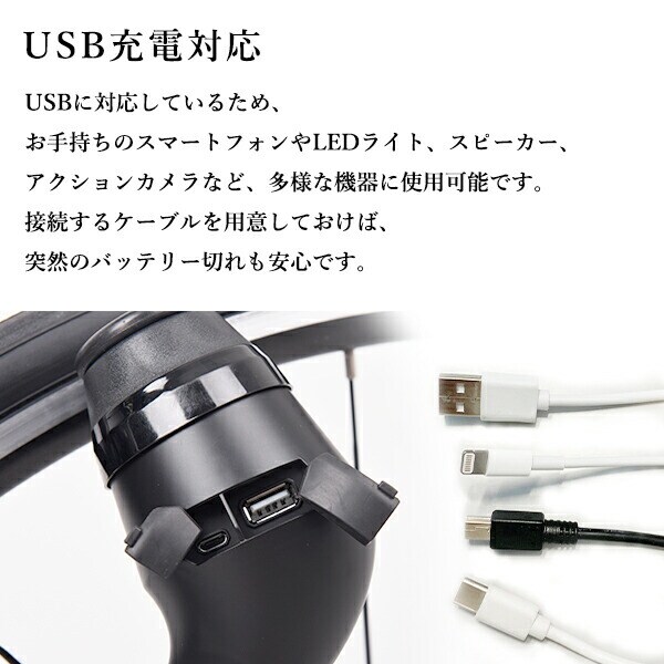 | 商品説明 | ●ダイナモ方式の自転車用発電器でUSB搭載製品を充電可能 ●前輪・後輪のどちらにも取付可能で従来の自転車用ライト等に比べ低摩擦でペダルの負担も少ない ●生活防水設計(キャップ取付時)で雨の日も取外し不要 ●容量:USB2.0(5V、500mAh出力) |