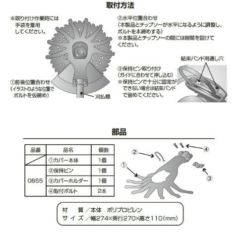 | 商品説明 | ●刃先をガードすることでチップ欠けを軽減、作業の安全性が向上 ●キワ刈り作業もスムーズ ●キックバックの軽減 ●草の巻付き軽減・草よせ効果 ●230mm、255mm径のチップソー用 |