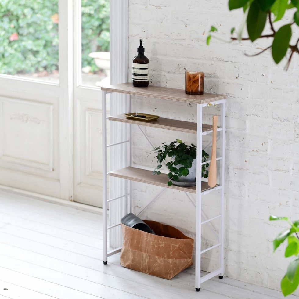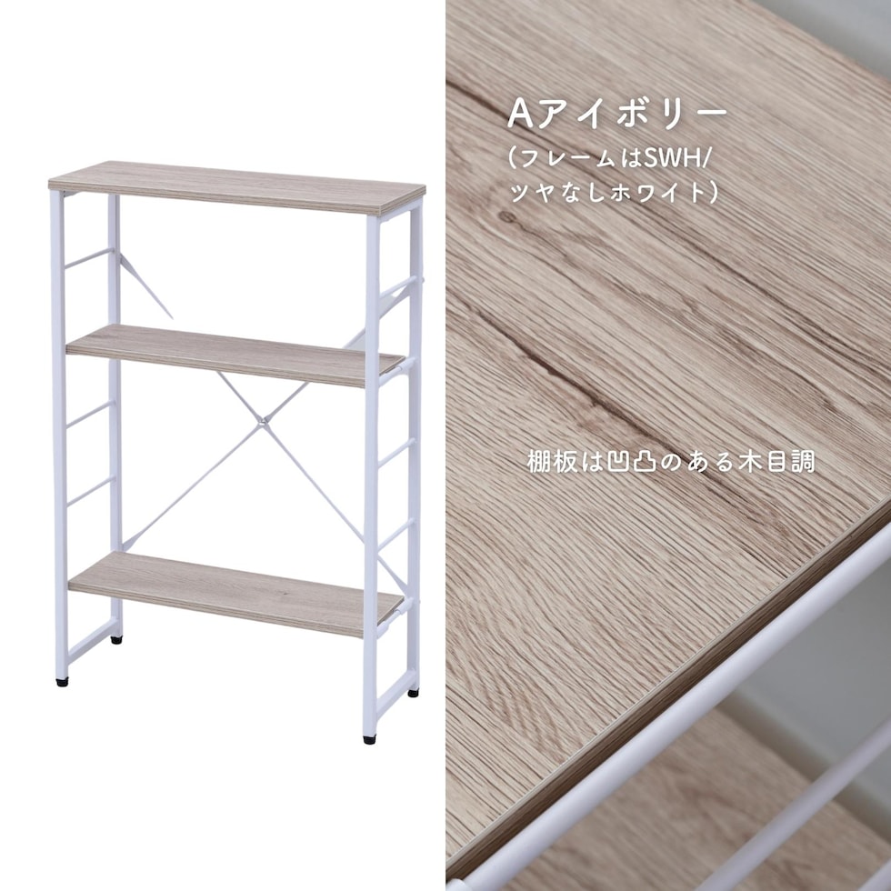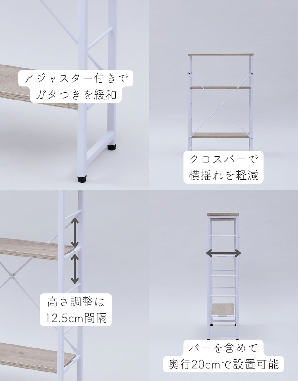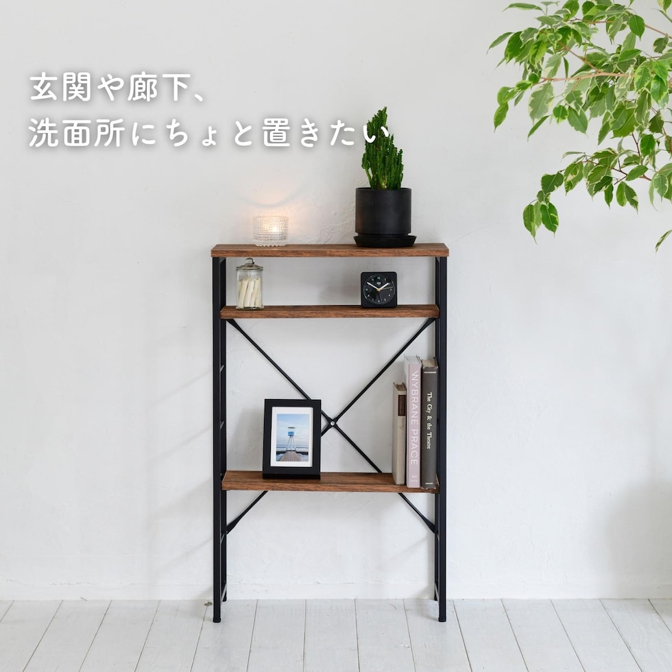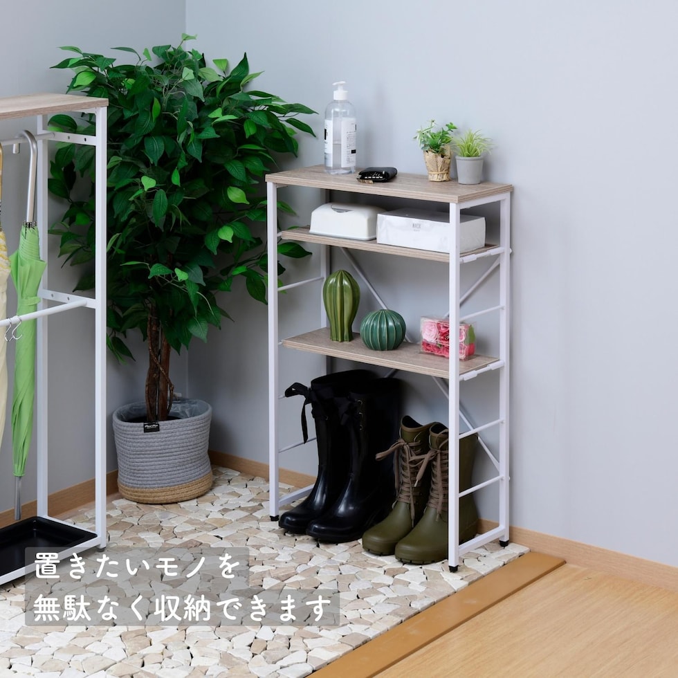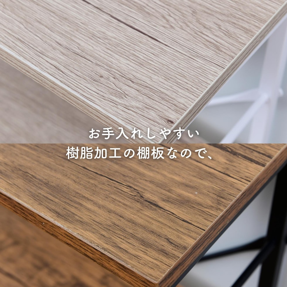 | 商品説明 | ●奥行き20cmで邪魔にならない、薄型のテーブル ●玄関、ソファ裏など狭い場所で使いやすい ●中の2枚の棚は高さを変えらて、置くものに合わせて調整可能 ●天板は木目調の樹脂加工でぬれたり汚れたりしてもお掃除カンタン ●アジャスター付きでガタツキを緩和(どの色でもアジャスターは黒色) ●背面クロスバー付きでぐらつきなくしっかり頑丈 ●天板サイズ:幅50 奥行き20cm ●棚板サイズ:幅46 奥行き15cm ●最上段時: 内寸高さ11.5cm、床から棚上まで67cmm ●最下段時: 内寸高さ15cm、床から棚上まで16.5cm ●棚板間内寸: 1段階で約11cm ●耐荷重: 天板5kg、棚板3kg |
