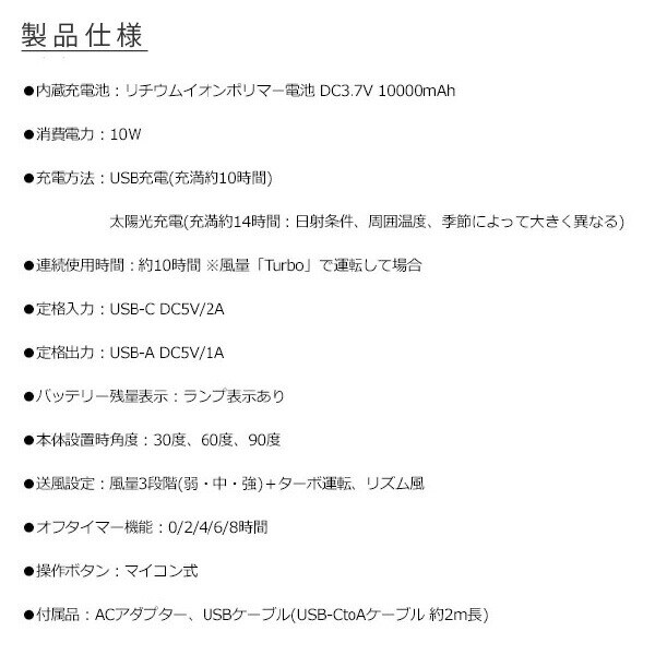 | 商品説明 | ●アウトドアや災害時に役立つパワフル扇風機!ソーラーパネル搭載でいつでもどこでも、お好きな場所で使用が可能 ●風量弱・中・強の3段階調整ができ、かつターボ運転搭載なのでパワフルな送風を実感! ●ソーラーパネルを搭載し、自ら発電して運転するので、電気代がかからない♪省エネ&エコロジーな扇風機! ●太陽光で発電した電気は、内蔵するバッテリーに充電されるので、電源がない場所や、停電時でも運転することができ、スマホの充電も可能!(外部USB機器に給電可能) ●本品はタフネスなのに、軽量でコンパクトな設計。折り畳みができ、収納場所を取らず、持ち運びに便利 ●風量をターボで運転しても、連続使用時間は驚きの約10時間! ●リズム風を搭載。42秒毎の強弱のついた自然に近い心地よい風を送る ●オフタイマー搭載。2時間後、4時間後、6時間後、8時間後と設定できる。連続運転も可能 【仕様】 ●内蔵充電池:リチウムイオンポリマー電池 DC3.7V 10000mAh ●消費電力:10W ●充電方法:USB充電(充満約10時間)/太陽光充電(充満約14時間:日射条件、周囲温度、季節によって大きく異なる) ●連続使用時間:約10時間 ※風量「Turbo」で運転して場合 ●定格入力:USB-C DC5V/2A ●定格出力:USB-A DC5V/1A ●バッテリー残量表示:ランプ表示あり ●本体設置時角度:30度、60度、90度 ●送風設定:風量3段階(弱・中・強)+ターボ運転、リズム風 ●オフタイマー機能:0/2/4/6/8時間 ●操作ボタン:マイコン式 ●付属品:ACアダプター、USBケーブル(USB-CtoAケーブル 約2m長) |