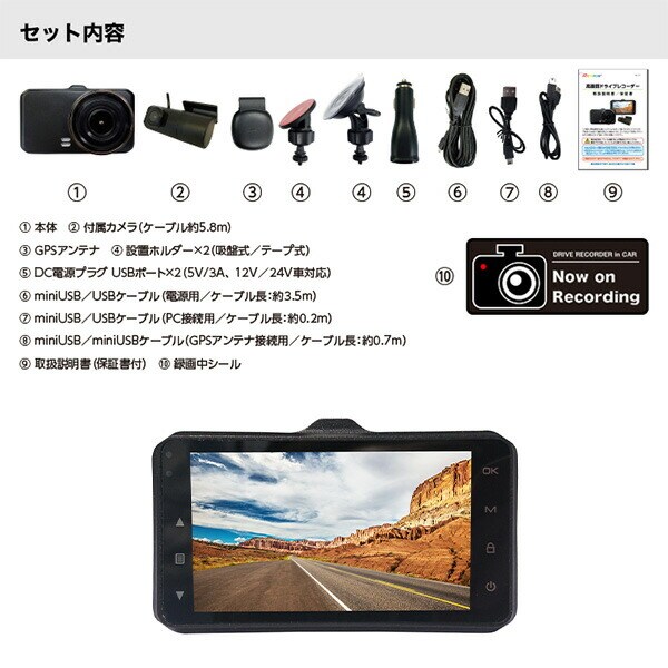 | 商品説明 | ●簡単取付け可能で工事不要 ●W録画:付属カメラで、2方向同時録画を実現 ●GPSアンテナ付 ●スーパーキャパシタ内蔵 ●WDR(逆光補正) ●Gセンサー機能搭載 ●自動繰返し録画 ●12V・24V車対応 ●Full HD 1920×1080 最大約200万画素※本体カメラ |