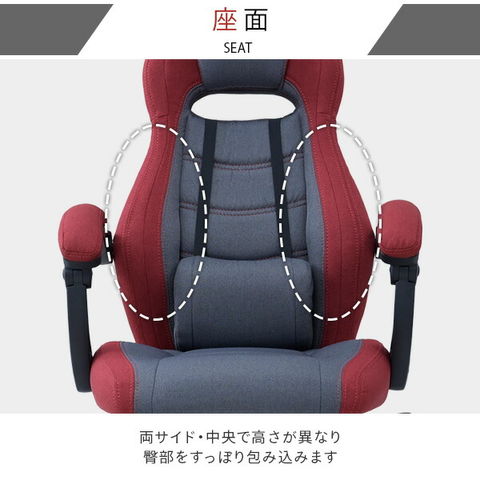 ●座面は両サイド・中央で高さが異なり、臀部をすっぽり包み込む形状