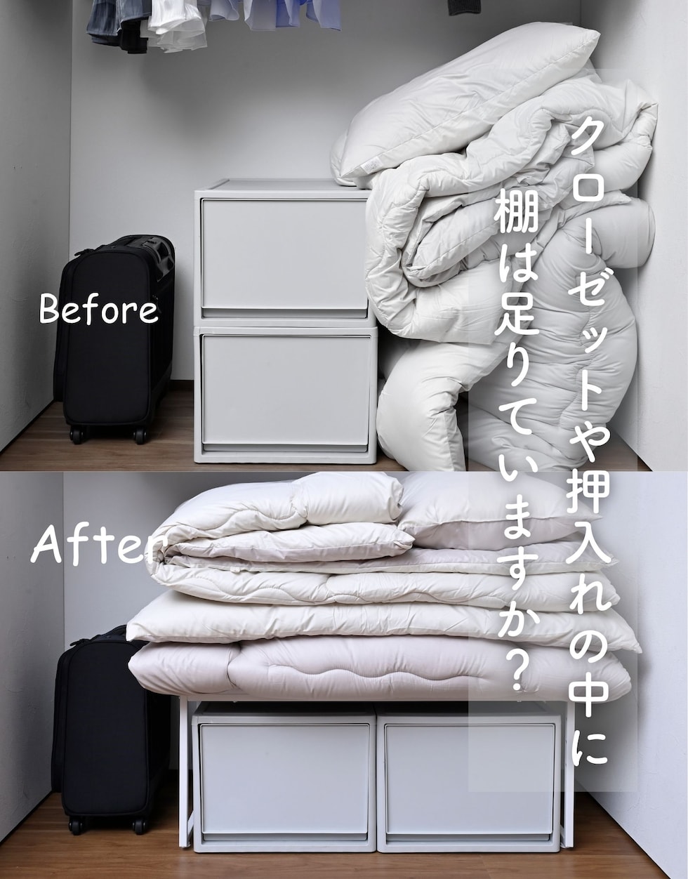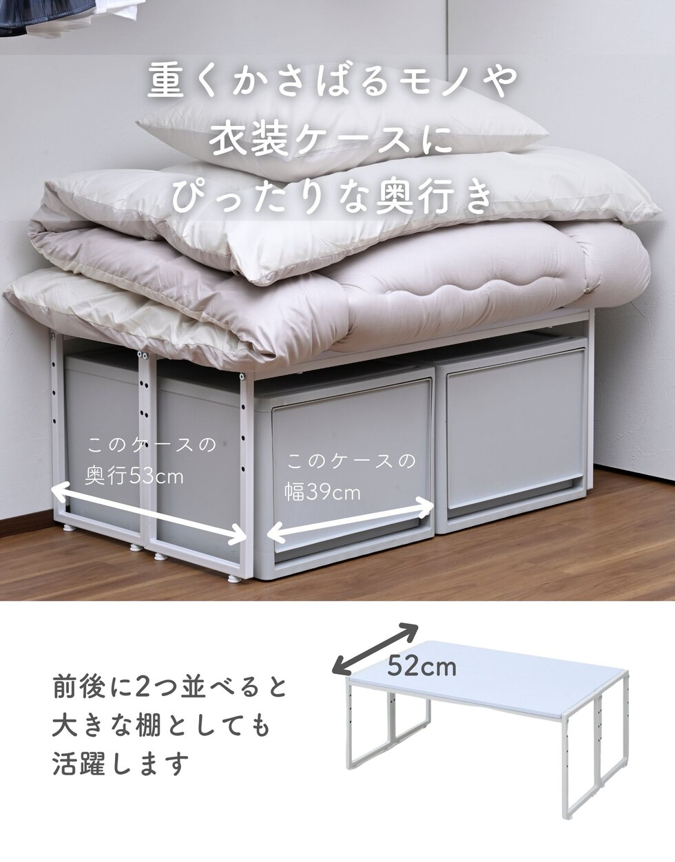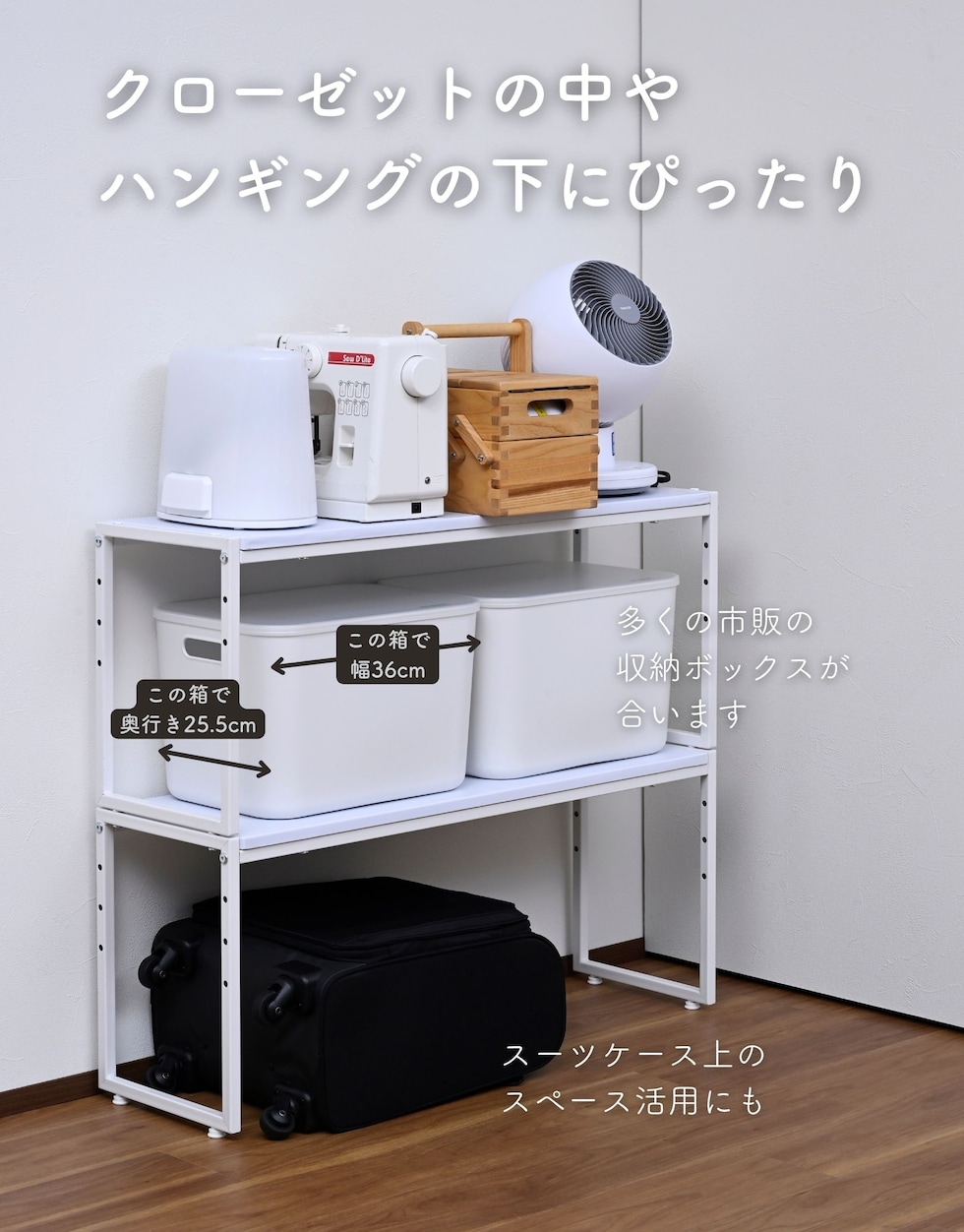 | 商品説明 | ※2025年6月1日より脚の色味がアイボリー寄りのホワイト→マットホワイトへ変更となりました。 ●押入れやクローゼットの中を仕切って使いやすくする、コの字型の整理棚 ●2個をタテに積み重ねたり、前後や左右に並べてすっきり収納 ●重ねても、並べても、単品でも使用可能 ●スチール製のフレームで横揺れが少なく頑丈 ●前後に並べると奥行52cm、衣装ケース置き場にピッタリ ●棚の高さは4段階で調整可能 ●棚板サイズ: 幅80 奥行26cm ●棚下内寸幅: 80cm ●耐荷重: 30kg ●棚下内寸高(単体時): 33 /26/ 21/ 16cm ●棚下内寸高(積み重ね時): 46.5/ 41.5/ 36.5/ 31.5/ 26.5/ 21.5/ 16.5cm |