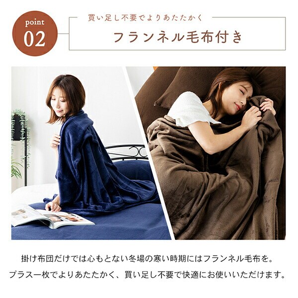 | 商品説明 | ●寒い季節に最適な届いてすぐに使えるあったか布団8点セット ●軽くて保温性の高いフリース生地を使用したリバーシブル布団カバーをセット ●極細フランネル繊維のあったか毛布 ●ムレにくく、保温力に優れ、ふっくら弾力性のある中空わたを使用 ●しっとりソフトな肌ざわりのピーチスキンの布団カバー付き ※枕、掛け布団、敷き布団は、生地の傷みを防ぐ為、シーツやカバーをかけてご使用ください。 ※干す際は、側生地の傷みや汚れを防ぐ為、布団をカバーで覆い干して下さい。 ※保管する際は、湿気の少ない場所に保管して下さい。 ※部分的に生地が汚れたら、すぐにつまみ洗いし、十分に乾燥させてください。 ※タンブラーなどの加熱乾燥機や、ドライヤーなどで乾燥させると、収縮や生地を傷めますので、ご使用はお避け下さい。 ※洗濯すると、形が変形する場合があります。 ※洗濯後は直ちに形を整えて干して下さい。 ※掛け布団カバー、枕カバー、毛布、シーツは、洗濯ネットを使用し、蛍光増白剤は使用禁止、中性洗剤を使用ください。 ※洗濯後は形を整えて陰干ししてください。 ※変形の原因になりますので、ご家庭での乾燥機の使用は避けてください。 |