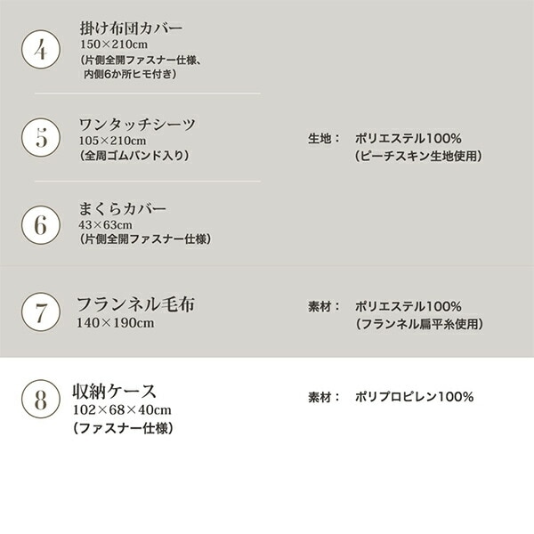 | 材質 | 【掛け布団、枕】 側地:ポリエステル100%(ピーチスキン生地使用) 中材:ポリエステル100%(中空わた) 【敷布団】 表生地:ポリエステル100%(ピーチスキン生地使用) 中材:ポリエステル100% (1.5kg) 巻わた:ポリエステル100% (1.5kg) 【掛け布団カバー、ワンタッチシーツ、枕カバー】 側地:ポリエステル100%(ピーチスキン生地使用) 【フランネル毛布】 ポリエステル100%(フランネル扁平糸使用) 【収納袋】不織布+PVC |