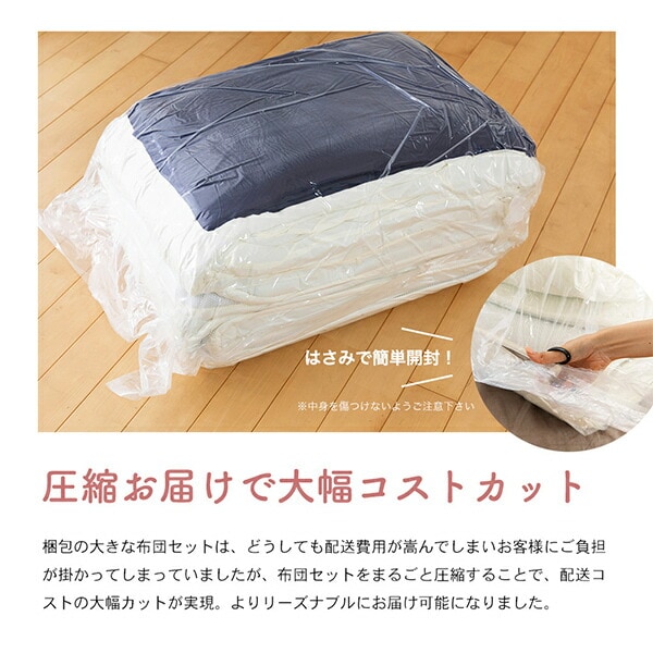 | 本体サイズ | 【掛け布団】 150×210cm 中わた量0.8kg 【枕】 43×63cm 中わた量0.4kg 【敷き布団】 100×200cm 中わた量3.4kg 【掛け布団カバー】 150×210cm 【ワンタッチシーツ 】 105×210cm 【枕カバー】 43×63cm 【フランネル毛布】 140×190cm 重量0.63kg 【収納袋】 102×68×40cm 重量0.3kg |