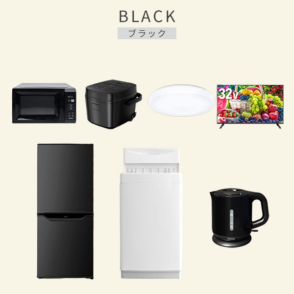 | 商品説明 | 【洗濯機】 ●容量:6.0kg(洗濯時)、1.5kg(風乾燥時) ●8つのコース搭載(標準・毛布・おいそぎ・ドライ・ソフト・つけおき・部屋干し・槽洗浄) 【冷蔵庫】 ●容量:106L(冷蔵室73L/冷凍室33L) ●年間消費電力量:268kWh/年(50Hz/60Hz) 【電子レンジ】 ●容量17L、ターンテーブル ●高周波出力:50Hz(500W、200W相当)、60Hz(650W、500W、200W相当) 【炊飯器】 ●炊飯容量:3.0合炊き ●8種の炊き分けメニュー:省エネ、白米、早炊き、玄米、無洗米、炊込み、おかゆ、温度調理 【シーリングライト】 ●全光束:3600lm ●30分、60分OFFタイマー付き 【32型液晶テレビ】 ●サイズ:32V型 ●2K対応ハイビジョン液晶テレビ 【電気ケトル】 ●容量:1.0L ●空焚き防止機能搭載 ●ラック以外メーカー保証:1年間 ※2023年4月より電子レンジがヘルツフリーの機種に変更になっています。 |