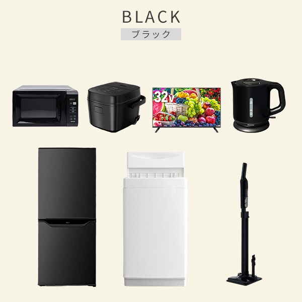 | 商品説明 | 【洗濯機】 ●容量:6.0kg(洗濯時)、1.5kg(風乾燥時) ●8つのコース搭載(標準・毛布・おいそぎ・ドライ・ソフト・つけおき・部屋干し・槽洗浄) 【冷蔵庫】 ●容量:106L(冷蔵室73L/冷凍室33L) ●年間消費電力量:268kWh/年(50Hz/60Hz) 【電子レンジ】 ●容量17L、ターンテーブル ●高周波出力:50Hz(500W、200W相当)、60Hz(650W、500W、200W相当) 【炊飯器】 ●炊飯容量:3.0合炊き ●8種の炊き分けメニュー:省エネ、白米、早炊き、玄米、無洗米、炊込み、おかゆ、温度調理 【32型液晶テレビ】 ●サイズ:32V型 ●2K対応ハイビジョン液晶テレビ 【電気ケトル】 ●容量:1.0L ●空焚き防止機能搭載 【軽量クリーナー】 ●わずか820gの軽量クリーナー ●連続使用時間:(強)約10分、(標準)約25分 ●ラック以外メーカー保証:1年間 ※2023年4月より電子レンジがヘルツフリーの機種に変更になっています。 |