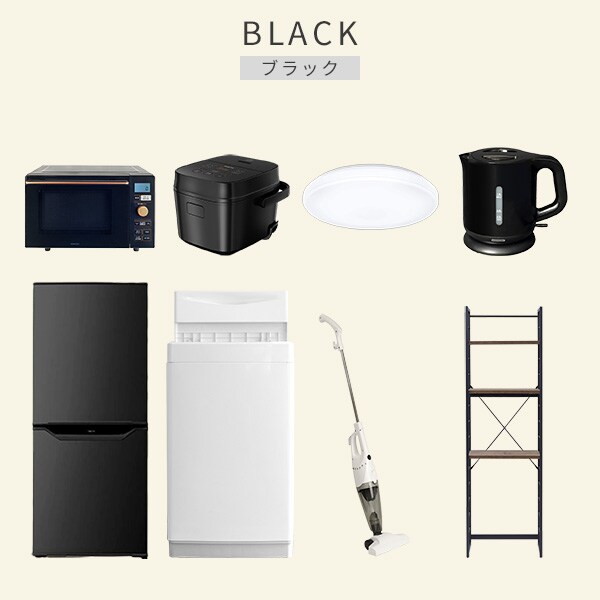 | 商品説明 | 【洗濯機】 ●容量:6.0kg(洗濯時)、1.5kg(風乾燥時) ●8つのコース搭載(標準・毛布・おいそぎ・ドライ・ソフト・つけおき・部屋干し・槽洗浄) 【冷蔵庫】 ●容量:106L(冷蔵室73L/冷凍室33L) ●年間消費電力量:268kWh/年(50Hz/60Hz) 【オーブンレンジ】 ●容量18L、フラットテーブル ●高周波出力:650W(60Hzのみ)/500W/200W相当 【炊飯器】 ●炊飯容量:3.0合炊き ●8種の炊き分けメニュー:省エネ、白米、早炊き、玄米、無洗米、炊込み、おかゆ、温度調理 【シーリングライト】 ●全光束:3600lm ●30分、60分OFFタイマー付き 【電気ケトル】 ●容量:1.0L ●空焚き防止機能搭載 【クリーナー】 ●スティック&ハンディの2WAY ●吸込仕事率:40W 【家電収納ラック】 ●棚やコンセントの高さを、モノに合わせて変更可能 ●2口コンセント付き(計1500Wまで)でよく使う家電や雑貨をすっきりひとまとめ ●ラック以外メーカー保証:1年間 |