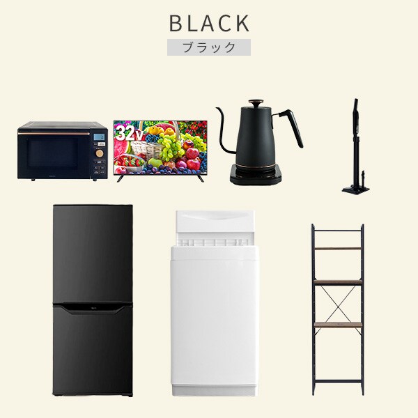 | 商品説明 | 【洗濯機】 ●容量:6.0kg(洗濯時)、1.5kg(風乾燥時) ●8つのコース搭載(標準・毛布・おいそぎ・ドライ・ソフト・つけおき・部屋干し・槽洗浄) 【冷蔵庫】 ●容量:106L(冷蔵室73L/冷凍室33L) ●年間消費電力量:268kWh/年(50Hz/60Hz) 【オーブンレンジ】 ●容量18L、フラットテーブル ●高周波出力:650W(60Hzのみ)/500W/200W相当 【32型液晶テレビ】 ●サイズ:32V型 ●2K対応ハイビジョン液晶テレビ 【電気温調ケトル】 ●容量:800ml ●温度設定範囲:60-100度の間で1度単位で温度調整可能 【軽量クリーナー】 ●わずか820gの軽量クリーナー ●連続使用時間:(強)約10分、(標準)約25分 【家電収納ラック】 ●棚やコンセントの高さを、モノに合わせて変更可能 ●2口コンセント付き(計1500Wまで)でよく使う家電や雑貨をすっきりひとまとめ ●ラック以外メーカー保証:1年間 |