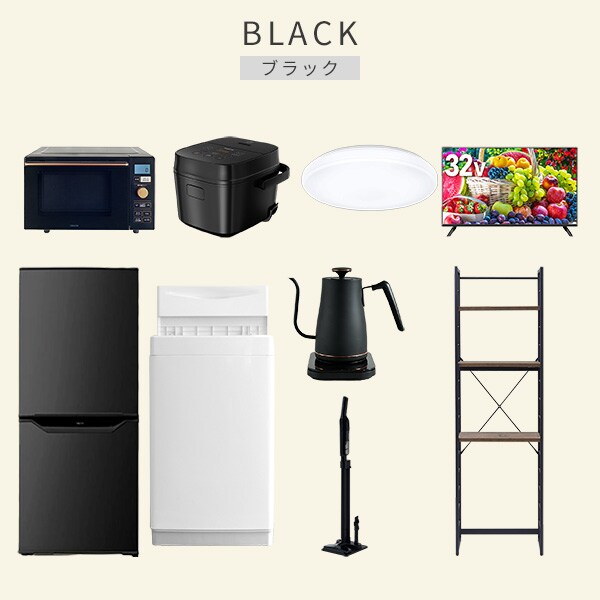 | 商品説明 | 【洗濯機】 ●容量:6.0kg(洗濯時)、1.5kg(風乾燥時) ●8つのコース搭載(標準・毛布・おいそぎ・ドライ・ソフト・つけおき・部屋干し・槽洗浄) 【冷蔵庫】 ●容量:106L(冷蔵室73L/冷凍室33L) ●年間消費電力量:268kWh/年(50Hz/60Hz) 【オーブンレンジ】 ●容量18L、フラットテーブル ●高周波出力:650W(60Hzのみ)/500W/200W相当 【炊飯器】 ●炊飯容量:3.0合炊き ●8種の炊き分けメニュー:省エネ、白米、早炊き、玄米、無洗米、炊込み、おかゆ、温度調理 【シーリングライト】 ●全光束:3600lm ●30分、60分OFFタイマー付き 【32型液晶テレビ】 ●サイズ:32V型 ●2K対応ハイビジョン液晶テレビ 【電気温調ケトル】 ●容量:800ml ●温度設定範囲:60-100度の間で1度単位で温度調整可能 【軽量クリーナー】 ●わずか820gの軽量クリーナー ●連続使用時間:(強)約10分、(標準)約25分 【家電収納ラック】 ●棚やコンセントの高さを、モノに合わせて変更可能 ●2口コンセント付き(計1500Wまで)でよく使う家電や雑貨をすっきりひとまとめ ●ラック以外メーカー保証:1年間 |