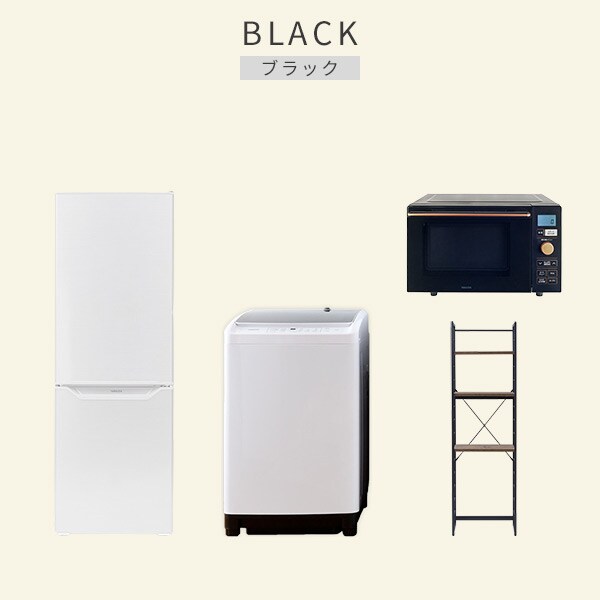 | 商品説明 | 【洗濯機】 ●容量:8.0kg(洗濯時)、1.5kg(風乾燥時) ●8つのコース搭載(標準・毛布・おいそぎ・ドライ・ソフト・つけおき・部屋干し・槽洗浄) 【冷蔵庫】 ●容量:173L(冷蔵室121L/冷凍室52L) ●年間消費電力量:250kWh/年(50Hz/60Hz) 【オーブンレンジ】 ●容量18L、フラットテーブル ●高周波出力:650W(60Hzのみ)/500W/200W相当 【家電収納ラック】 ●棚やコンセントの高さを、モノに合わせて変更可能 ●2口コンセント付き(計1500Wまで)でよく使う家電や雑貨をすっきりひとまとめ ●ラック以外メーカー保証:1年間 |