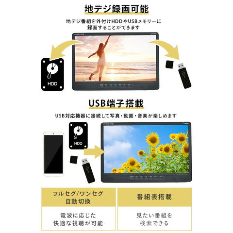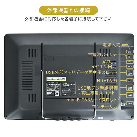 | 商品説明 | ●パソコンのサブモニターとしても使用できる!※別売HDMIコードにて接続 ●ワンセグフルセグ自動切換 ●番組表搭載 ●スピーカー:2W+2W ●推奨使用環境:使用温度0~40℃(※結露なきこと) 保存温度:10℃~60℃ ●端子:電源入力・HDM入力・AV入力・イヤホン出力・アンテナ入力・USBポート×2・mini B-CASスロット ・DVD/CDプレーヤー 対応フォーマット:DVDビデオ、DVD-R/RW(CPRM/VR対応)、音楽CD、CD-R/RW ・地デジチューナー 受信チャンネル:地上デジタル放送(UHF/物理CH:13~62) EPG番組ガイド:8日 ・メディアプレーヤーソフト 再生可能ファイル保存形式:静止画 JPEG、PNG、BMP(画像サイズ1280×720pixまで) 音楽:MP3、WAV 動画:MP4、AVI テキスト:TXT ・対応ファイル形式は、すべてのファイルの再生を保証するものではありません ●電源:AC100V-240V 50/60HZ (PD対応ACアダプター) 出力DC12V/24V (PD対応シガーソケットアダプター) ※+アース車では使用できません モバイルバッテリー (PD対応20W以上で12V出力可能なもの) 容量10000mAh以上を推奨(別売) ※約2.5時間稼働 ●消費電力:約20W ※待機時:約1W ●液晶ディスプレイ:17.3インチTFT/LEDバックライト/1600*900*RGB ●付属品:リモコン、リモコン用電池、PD対応用ACアダプター、PD対応シガーソケットアダプター、USB-C&USB-Cケーブル、AVケーブル、TV受信用簡易アンテナ(屋外用)、mini B-CASカード、取扱説明書 ※TV受信用簡易アンテナを使用したテレビ視聴について: 本製品付属のアンテナは、屋外用の簡易的なアンテナです。 テレビの電波塔から遠い場所、コンクリートの壁を使用した建物の中では受信ができない場合があります。 ※※テレビを快適に受信するには: ・窓際や屋外など受信感度が良い場所でご使用ください。 ・別売のアンテナケーブル(F型同軸ケーブル)に繋いだ上でご使用ください。 |