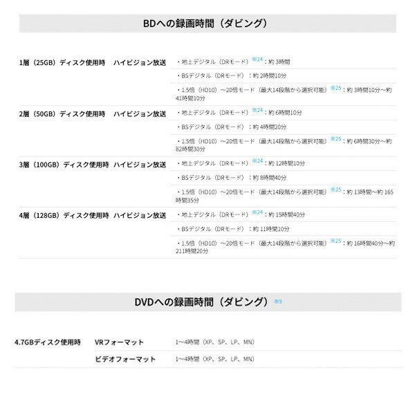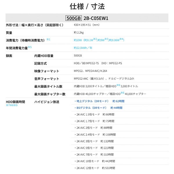 | 商品説明 | ●消費電力:20W ●ハードディスク容量: 500GB ●チューナー:地上デジタル×2、BS/CSデジタル×2 ●端子:HDMI出力×1、USB×1(外付けHDD用)、LAN×1 ●付属品:リモコン、リモコン用単3形乾電池×2、取扱説明書、保証書、アンテナケーブル(1.2m)、B-CASカード、電源コード(1.5m) ●再生できるメディア:BDビデオ、BE-RE、BE-R、DVDビデオ、DVD-R、DVD-RW、音楽CD、CD-R、CD-RW ●新作の連続ドラマを4週間分自動でお録りおき ●録画した番組を約5分ごとに子画面表示。早送りしなくても中身がパッと分かる ●タレント名やジャンルなどのお好みのワードに関連する番組を手間なく自動録画。リモコンの「おまかせ」ボタンを押せば設定したワードごとにまとめてリスト表示されるので見たい番組がすぐに見つかる ●再生ブラインド操作:十字キーと決定ボタンで手元を見ずに簡単操作 ●買換えお引っ越しダビング:録りためた番組をLAN接続で新しいレコーダーに簡単にダビング ●コンパクトでどこにでも置きやすい |