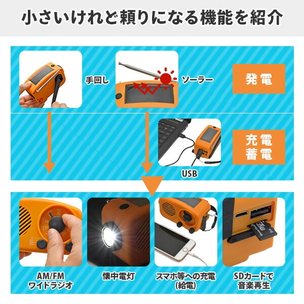 YAMAZEN ヤマゼン 山善 通販 防災 災害 非常時 緊急時 避難時 アイテム グッズ 対策 キャンプ アウトドア 野外 日常使い 普段使い 充電 チャージ チャージャー 充電器 手回し手動 ソーラー 太陽光 発電 蓄電池 給電 ラジオ LED ライト 懐中電灯 携帯 スマートフォン スマホ 対応 アナログチューナー SDカード MP3 メディア再生 小型 手のひらサイズ コンパクト 軽量 |
