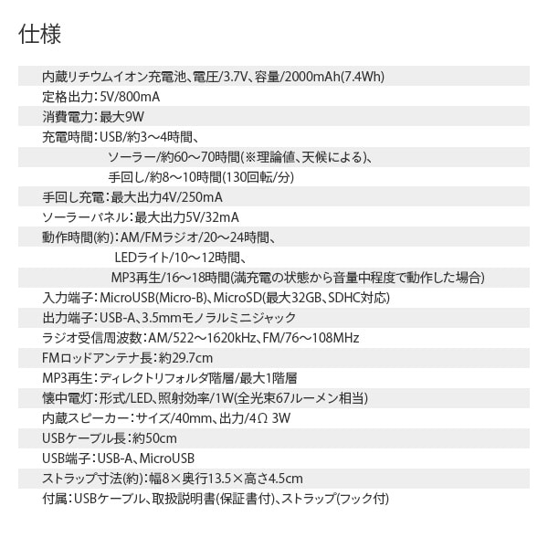 | 商品説明 | ●手のひらサイズのコンパクトな防災ラジオ!重さわずかリンゴ1個分(260g) ●懐中電灯、AM・FM・ワイドFMラジオ、MP3再生/内蔵蓄電池によるスマートフォン充電の4役あり。ソーラーパネル、手回し、USBの3種の充電方法が可能 【仕様】 ●電源:内蔵リチウムイオン充電池、電圧/3.7V、容量/2000mAh(7.4Wh) ●定格出力:5V/800mA ●消費電力:最大9W ●充電時間:USB/約3~4時間、ソーラー/約60~70時間(※理論値、天候による)、手回し/約8~10時間(130回転/分) ●手回し充電:最大出力4V/250mA ●ソーラーパネル:最大出力5V/32mA ●動作時間(約): AM/FMラジオ/20~24時間、LEDライト/10~12時間、MP3再生/16~18時間(満充電の状態から音量中程度で動作した場合) ●入力端子:MicroUSB(Micro-B)、MicroSD(最大32GB、SDHC対応) ●出力端子:USB-A、3.5mmモノラルミニジャック ●ラジオ受信周波数:AM/522~1620kHz、FM/76~108MHz ●FMロッドアンテナ長:約29.7cm ●MP3再生:ディレクトリフォルダ階層/最大1階層 ●懐中電灯:形式/LED、照射効率/1W(全光束67ルーメン相当) ●内蔵スピーカー:サイズ/40mm、出力/4Ω 3W ●USBケーブル長:約50cm ●USB端子:USB-A、MicroUSB ●ストラップ寸法(約):幅8×奥行13.5×高さ4.5cm ●付属:USBケーブル、取扱説明書(保証書付)、ストラップ(フック付) |