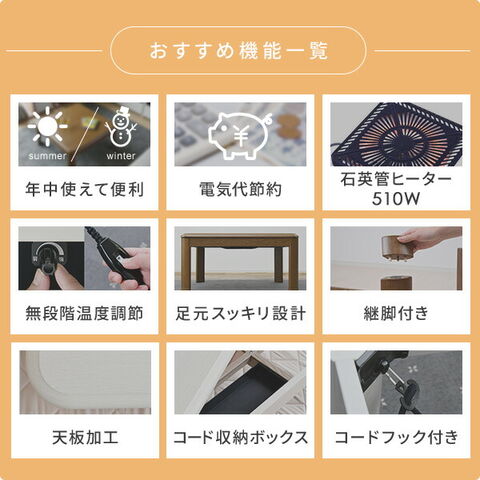 | 本体サイズ | 【こたつ本体】 120cmタイプ:幅120x奥行80x高さ36-41cm |