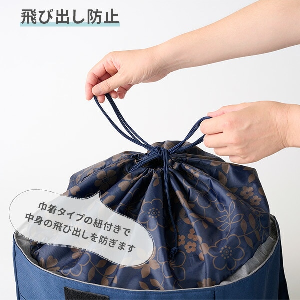 ●開口部が大きいので中身を出し入れしやすく、飛び出しを防ぐ巾着仕様