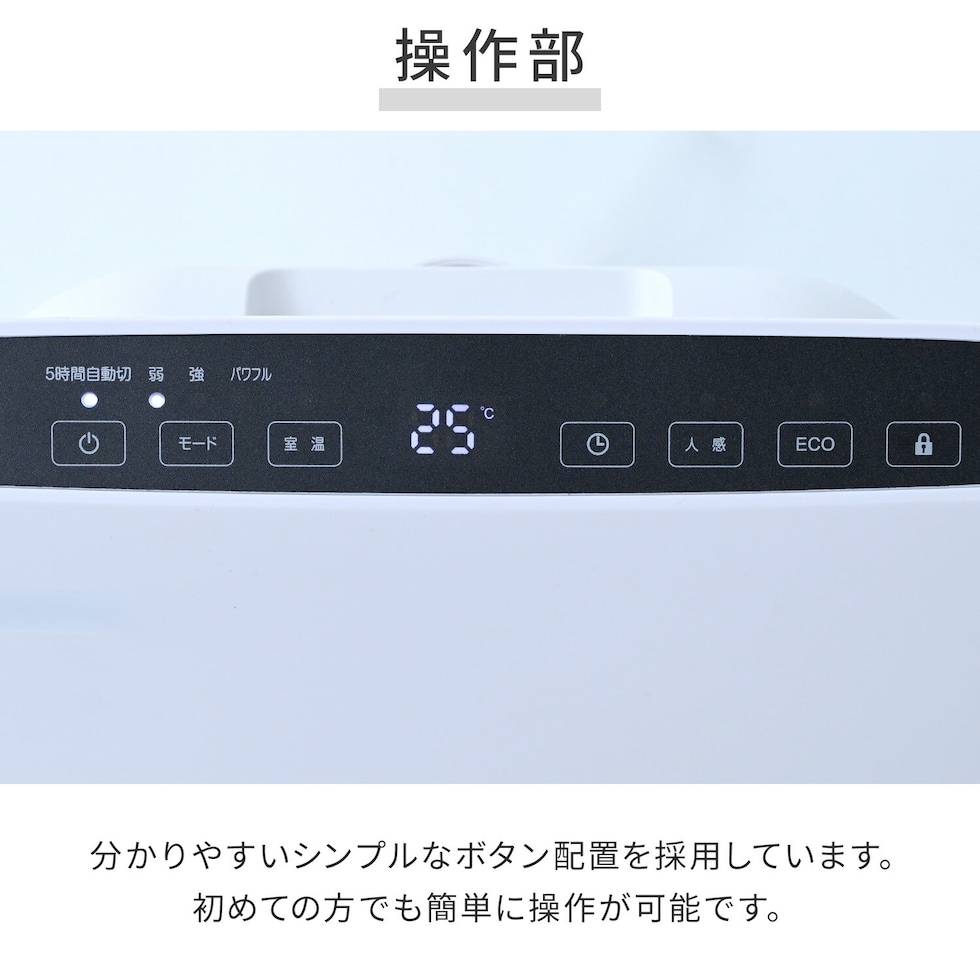 | 商品説明 | ●電源:AC100V(50/60Hz) ●消費電力:1200W ●電源コード長:約1.6m ●安全装置:転倒オフスイッチ、サーモスタット、温度ヒューズ ●温風モード3段階:弱/強/パワフル ●人感センサー搭載 ●温度センサー搭載:16/19/22/25/28度の5段階設定可能 ●ECOモード搭載:一定のタイミングで「パワフル」→「強」→「弱」を繰り返して運転します ※パワフル運転を継続するよりも約40%程度の節電になります ●切タイマー:1-4時間 ●5時間オートオフ ※人感、温度センサー運転中はオートオフ機能は働きません ●チャイルドロック搭載 ●メモリー機能:電源プラグを抜かずに運転する場合は停止前の設定で運転が始まります ●メーカー保証:1年間 ※2025年8月から型番を「DSF-VU121」から「DPSF-EU12」に変更しております <仕様変更点> ・ECO運転モードを搭載しました ・人感センサーを従来の球型から平面パネル型に変更しました ・外観デザインを変更しました |