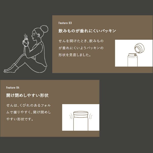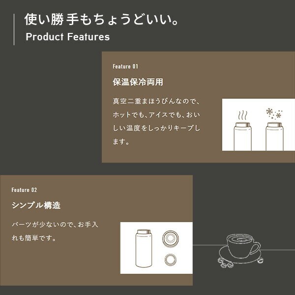 | 商品説明 | ●自宅で淹れたコーヒーを持ち運ぶのにちょうどいいサイズ。おいしい温度と香りを閉じ込めて、外出先でもほっとひと息 ●ステンレス真空断熱構造でしっかり外気温を遮断、保温保冷効果に優れています ●本体の高さは約13.6cmのコンパクトサイズで小さなカバンに入れやすい ●胴部の径は約5.7cmのスリムタイプで握りやすい ●軽量タイプ(約115g)で携帯に便利 ●開けたときに飲みものが垂れにくいパッキン ●開けやすく、閉めやすい形状のせん ●パーツは全部で3点と少なくお手入れも楽です ●ふたは指の力が掛けやすく、開けやすくなっています ●本体は丸洗いができます ●容量200ml |